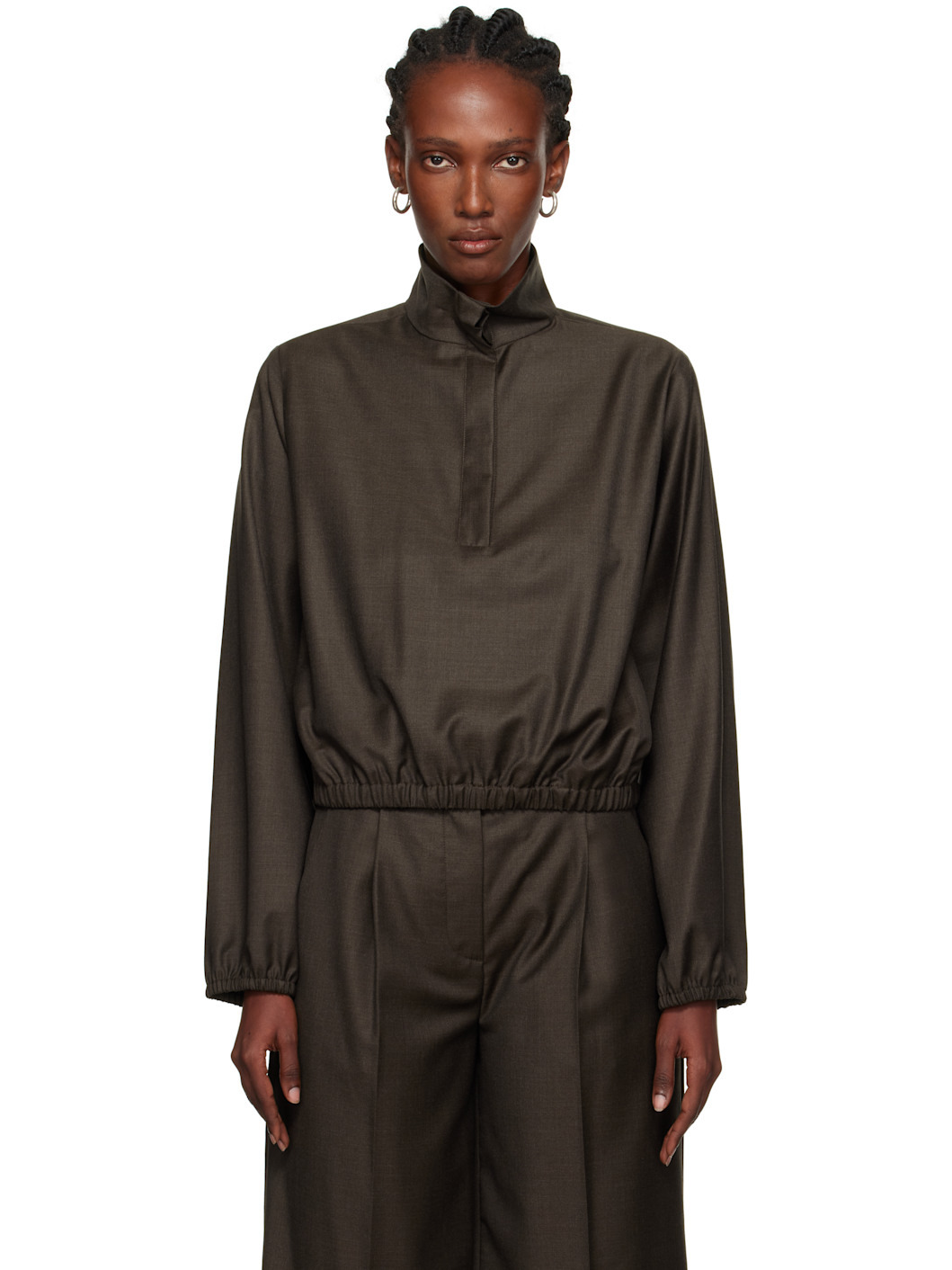 Super 120s virgin wool twill jacket. · Certified OEKO-TEX® Standard 100 · Stand collar · Concealed button placket · Seam pockets at waist · Elasticized hem and cuffs Supplier color: Grizzly Body: 100% virgin wool. Pocket lining: 100% viscose. Made in Romania 252473F107005