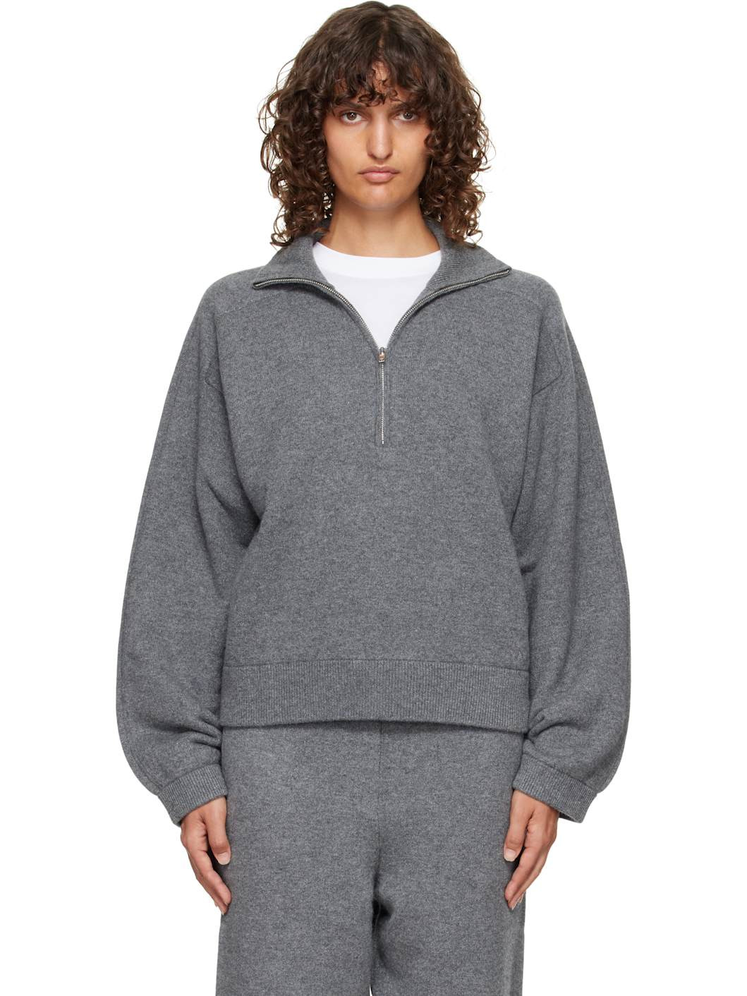 Cashmere French terry sweater. · OEKO-TEX® STANDARD 100-certified · Rib-knit stand collar, hem, and cuffs · Half-zip closure · Logo embroidered at front hem · Dropped saddle shoulders Supplier color: Anthracite melange 100% cashmere. Made in Italy 252473F097000