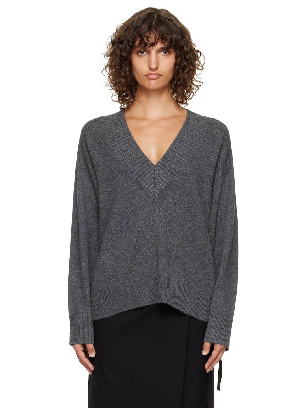 Knit cashmere sweater. · OEKO-TEX® STANDARD 100-certified · Rib-knit V-neck, hem, and cuffs · Logo embroidered at front hem · Dropped saddle shoulders Supplier color: Anthracite melange 100% cashmere. Made in Italy 252473F100001