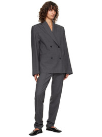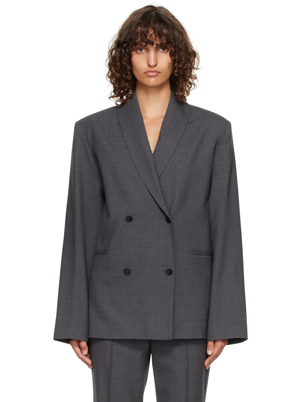 Stretch virgin wool grain de poudre blazer. · OEKO-TEX® STANDARD 100-certified · Shawl lapel · Double-breasted button closure · Welt pockets at waist · Padded shoulders · Welt pocket at interior · Full satin lining Supplier color: Anthracite melange Body: 95% virgin wool, 5% elastane. Lining: 100% viscose. Made in Romania 252473F069000
