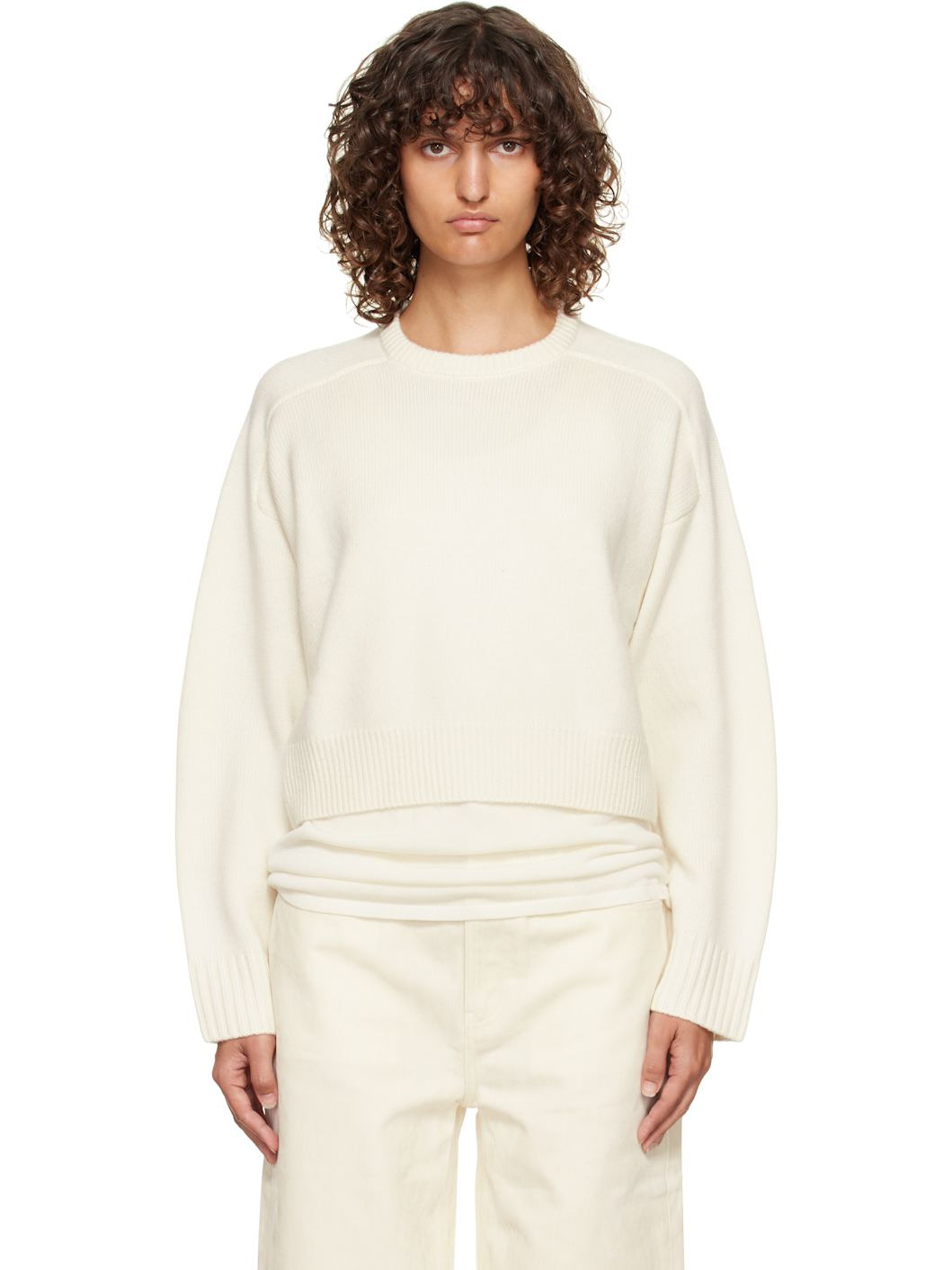 Knit extrafine merino wool- and cashmere-blend sweater. · Certified OEKO-TEX® STANDARD 100 · Rib-knit crewneck, cropped hem, and cuffs · Logo embroidered at front hem · Dropped saddle shoulders Supplier color: Ivory 90% extrafine merino wool, 10% cashmere. Made in Italy 252473F096009