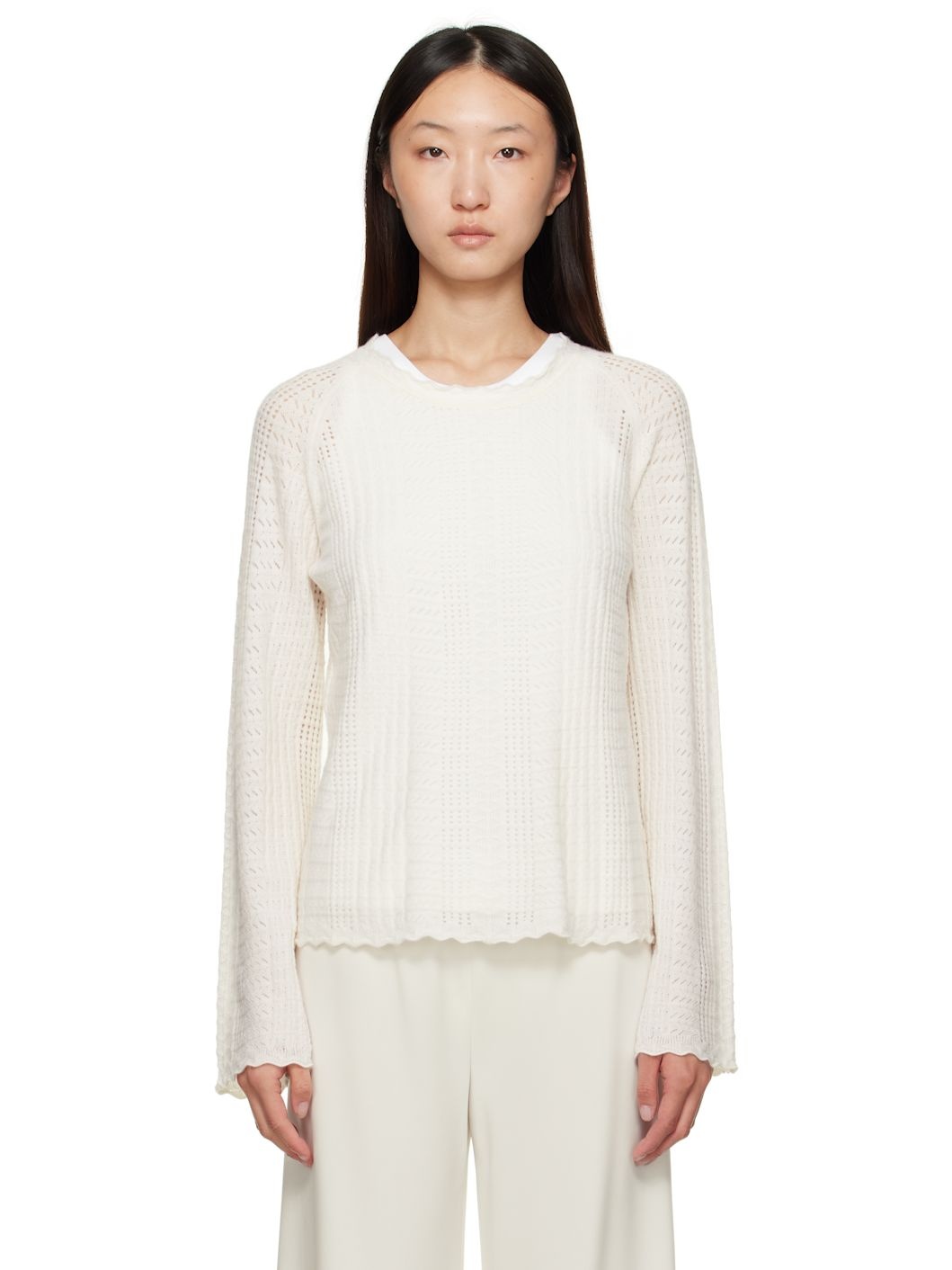 Pointelle-knit stretch wool- and cashmere-blend sweater. · OEKO-TEX® STANDARD 100-certified · Semi-sheer · Scalloped edge at crewneck, hem, and cuffs · Raglan sleeves Supplier color: Ivory 68% wool, 30% cashmere, 2% elastane. Made in Italy 252473F096015