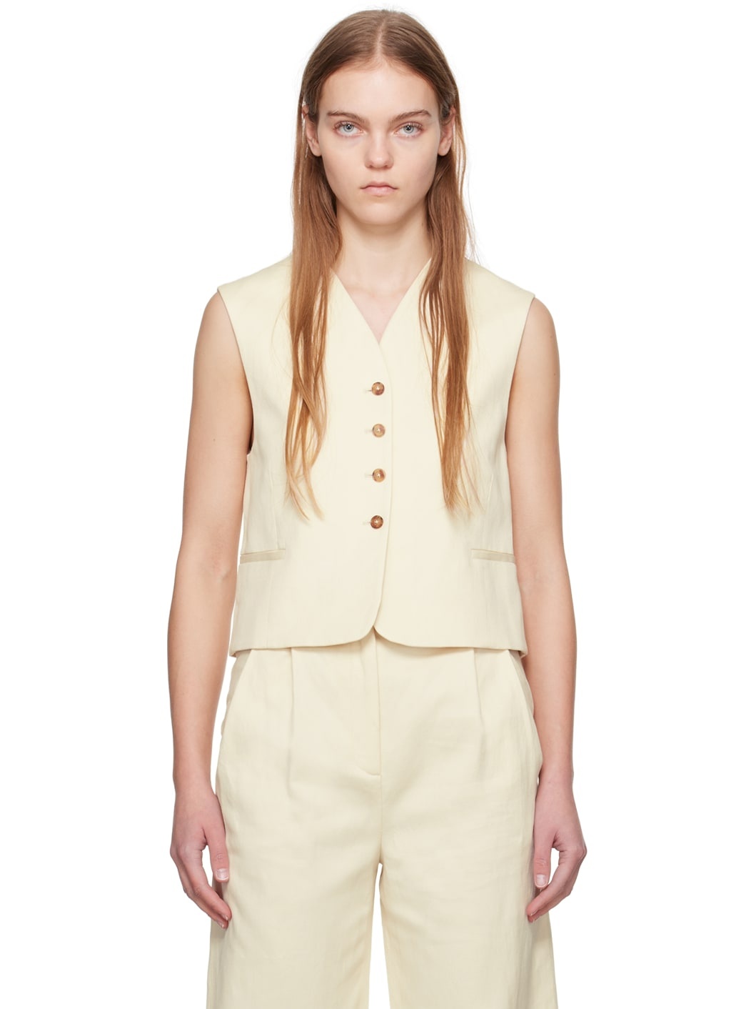 OEKO-TEX®-certified cotton- and linen-blend twill vest. · Y-neck · Button closure · Welt pockets · Adjustable button tab at back · Partial plain-woven lining Supplier color: Frost ivory Body: 61% cotton, 39% linen. Lining: 100% viscose. Made in Romania 241473F068001
