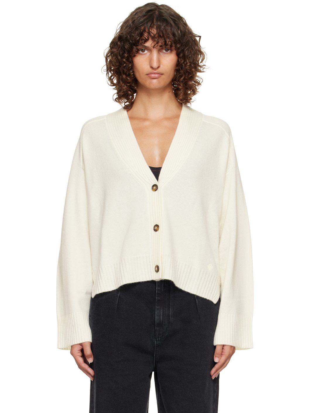 Knit cashmere cardigan. · OEKO-TEX® STANDARD 100-certified · Rib-knit Y-neck, hem, and cuffs · Button closure · Logo embroidered at front hem · Vented side seams · Dropped saddle shoulders Supplier color: Ivory 100% cashmere. Made in Italy 252473F095015