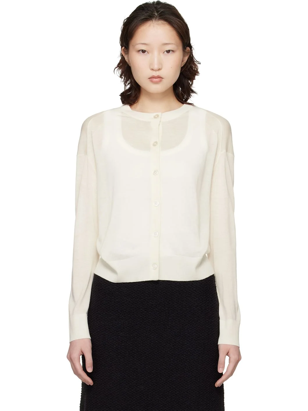 Lightweight knit cashmere cardigan. · Certified OEKO-TEX® Standard 100 · Rib-knit round neck, hem, and cuffs · Button closure · Offset shoulder seams Supplier color: Ivory 100% cashmere. Made in Italy 261473F095001