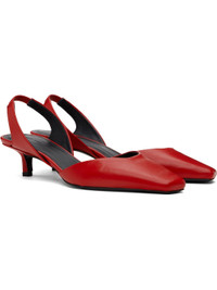 Buffed lambskin heels in red. · Square toe · Partially elasticized slingback strap · Logo embossed at padded footbed · Covered kitten heel with rubber injection · Leather sole · Heel: H1.5" Supplier color: Tomato Upper: lambskin. Sole: leather, rubber. Made in Italy 251473F125003