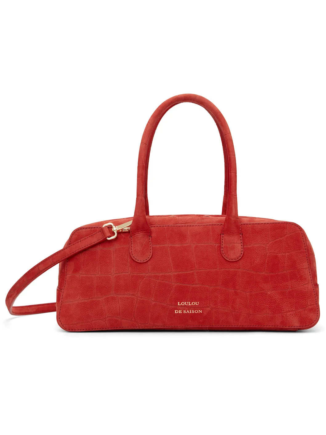 Croc-embossed nubuck shoulder bag. · Rolled carry handles · Adjustable and detachable crossbody strap · Logo stamp at face · Two-way zip closure · Zip pocket at interior · Twill lining · H5.25" x W13" x D5" Supplier color: Red Leather. Made in Italy 261473F048002