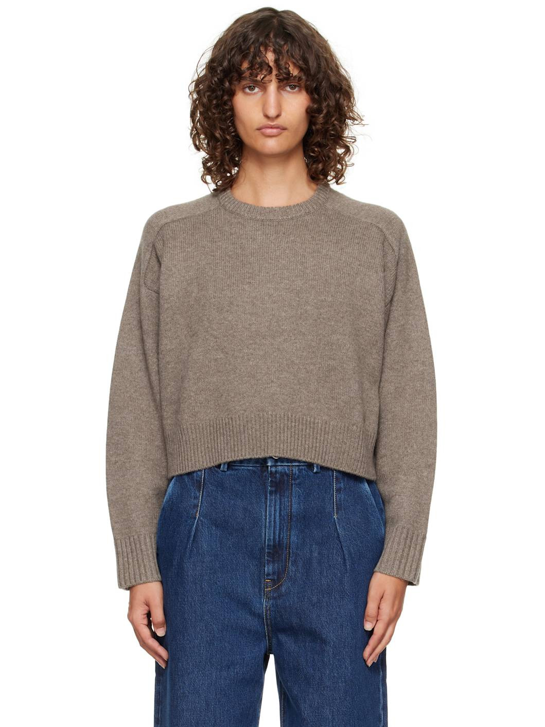 Knit extrafine merino wool- and cashmere-blend sweater. · Certified OEKO-TEX® STANDARD 100 · Rib-knit crewneck, cropped hem, and cuffs · Logo embroidered at front hem · Dropped saddle shoulders Supplier color: Taupe melange 90% extrafine merino wool, 10% cashmere. Made in Italy 252473F096008