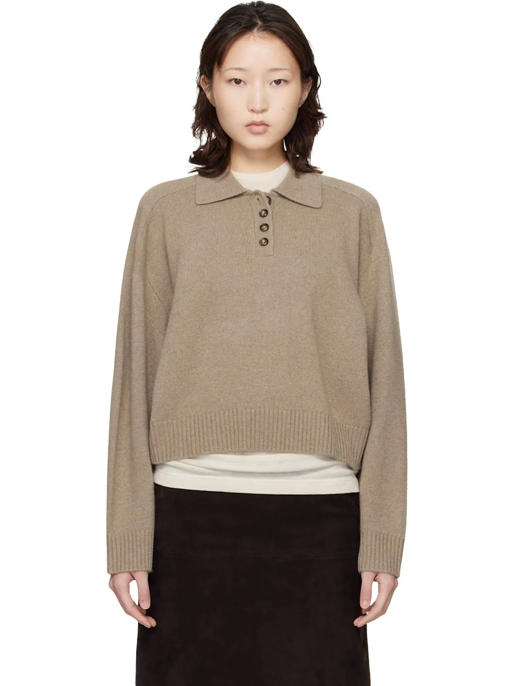 Knit cashmere sweater. · Certified GRS recycled cashmere · Rib-knit spread collar, hem, and cuffs · Button placket · Saddle shoulders extend to back · Embroidered logo at front hem Supplier color: Taupe Melange 100% cashmere. Made in Italy 261473F108002