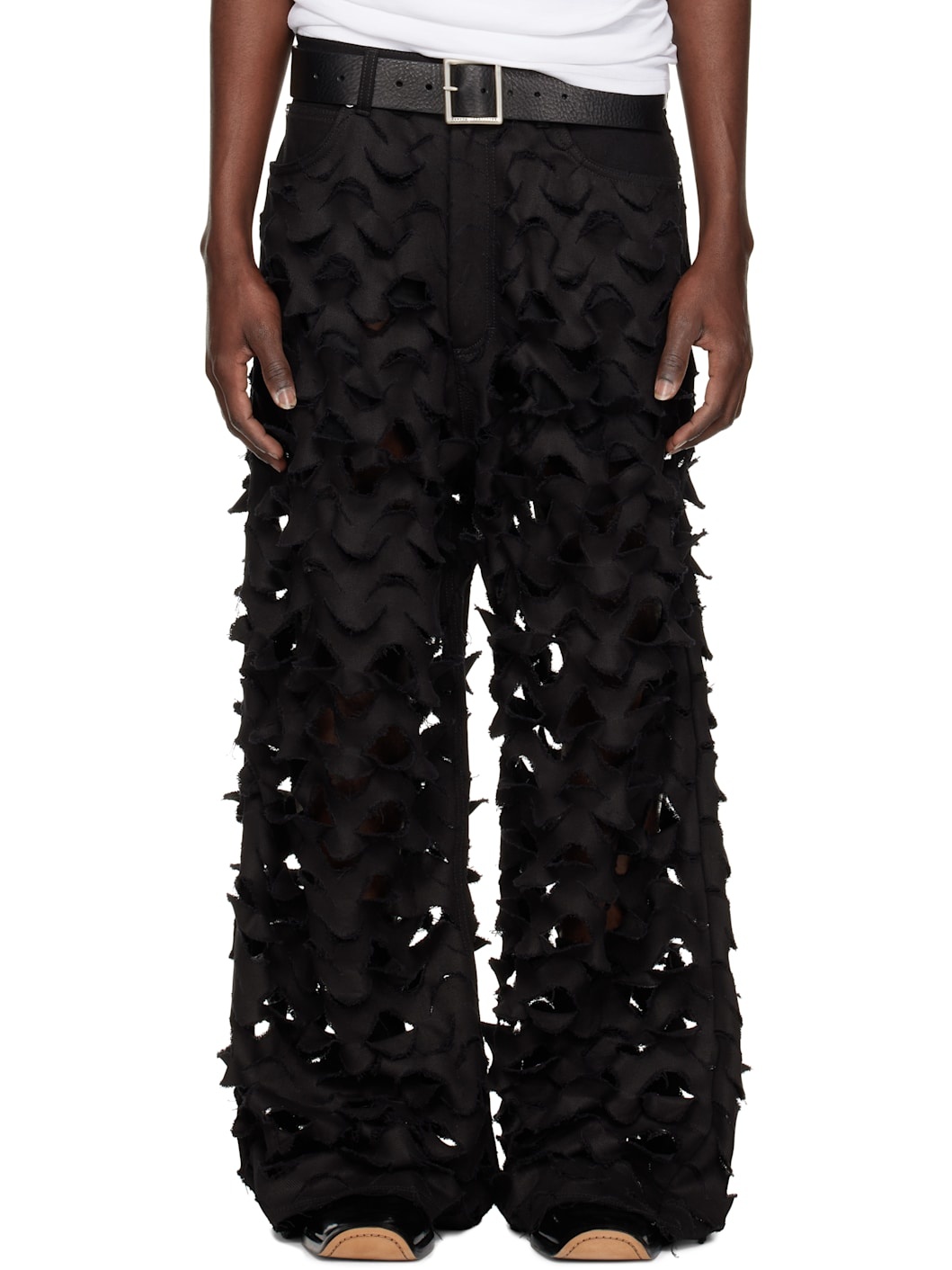 Non-stretch denim jeans. Cutout pattern with raw edges throughout. · Belt loops · Five-pocket styling · Zip-fly · Frayed edge at cuffs · Leather logo patch at back waistband · Logo-engraved silver-tone hardware Supplier color: Black 100% cotton. Made in Italy 251331M186006