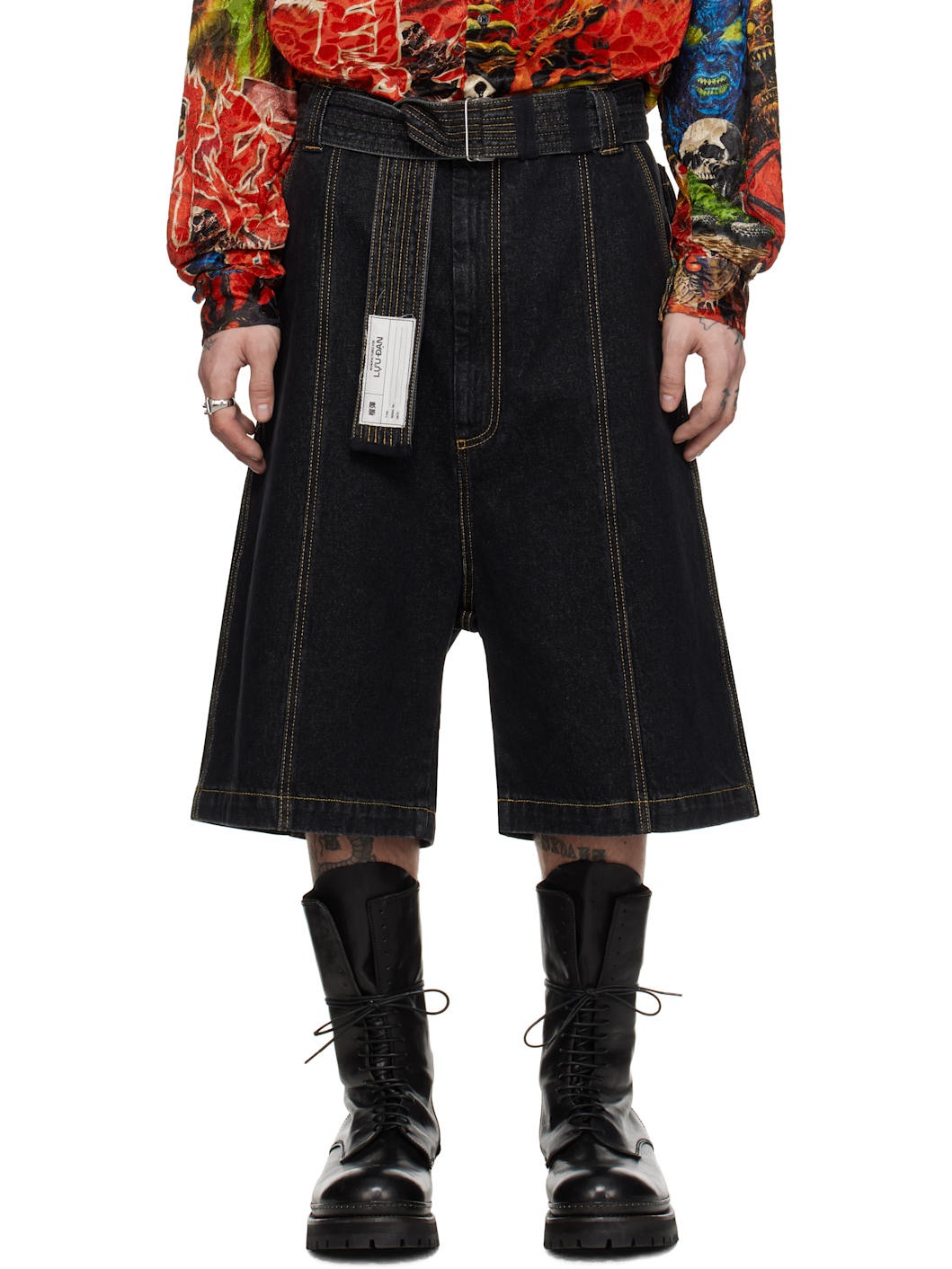 Heavyweight non-stretch denim shorts. Fading throughout. · Belt loops and detachable cinch belt · Four-pocket styling · Zip fly · Contrast stitching in beige Supplier color: Black Body: 100% cotton. Lining: 50% cotton, 50% polyester. Made in Italy 251331M193003