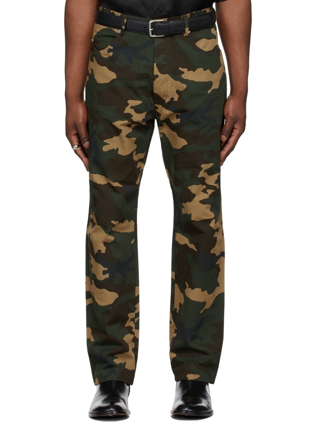 Straight-leg cotton and Cordura® nylon-blend ripstop jeans featuring camouflage pattern in tones of beige, green, and black. · Mid-rise · Five-pocket styling · Belt loops at waistband · Reptile-embossed faux-leather logo patch at back waistband · Button-fly · Logo-engraved silver-tone hardware Available exclusively at SSENSE. Supplier color: Camo print 70% cotton, 30% polyamide. Made in Portugal 221331M186005