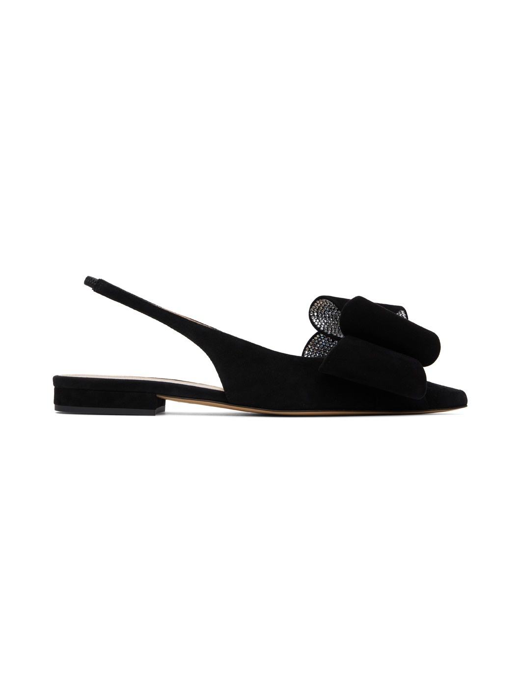 Suede slippers in black. · Pointed toe · Bow with crystal-cut accents at vamp · Partially elasticized slingback strap · Logo stamp at padded leather footbed · Buffed leather lining · Stacked heel with rubber injection · Leather sole Supplier color: Black Leather. Made in Italy 242404F118004