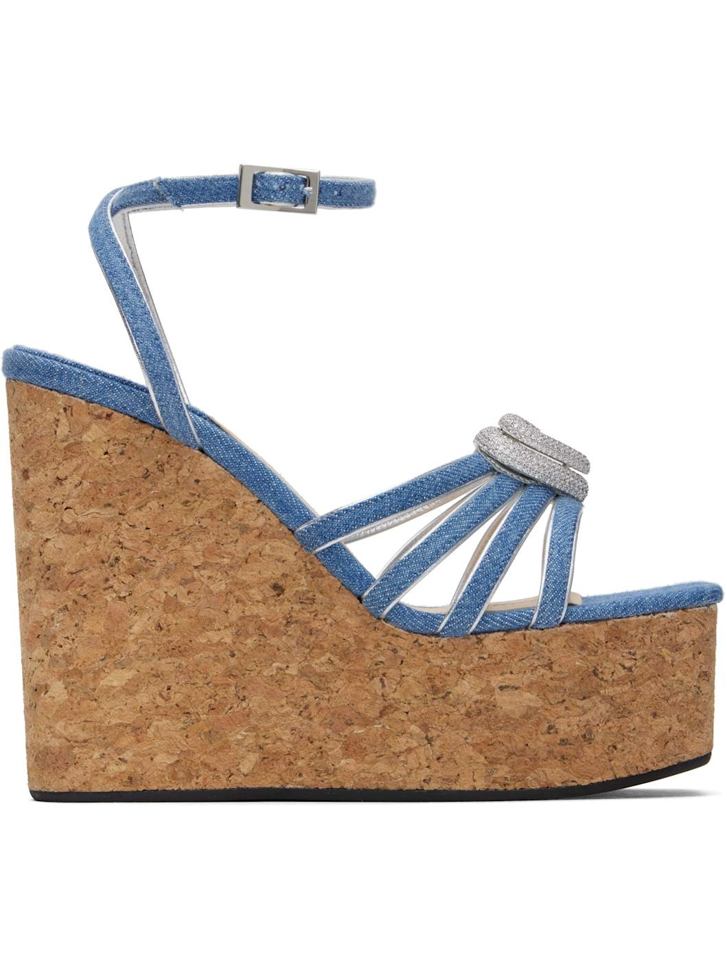 Denim heeled sandals in blue. · Open square toe · Straps and crystal-cut graphic hardware at vamp · Pin-buckle ankle strap · Logo stamp at padded footbed · Grained leather lining · Cork wedge heel and platform midsole · Treaded rubber sole · Platform: H2" · Heel: H4.75" Supplier color: Blue Upper: textile. Sole: leather, rubber. Made in Italy 251404F125018