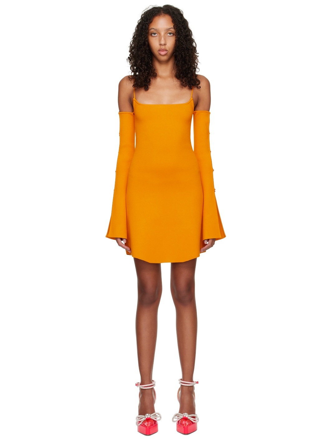 Rib knit viscose-blend dress. · Square neck · Fixed spaghetti shoulder straps · Cutouts at sleeves · Crystal-cut bow accents at sleeves · Extended flared cuffs Supplier color: Orange 70% viscose, 30% polyester. Made in Italy 231404F052014
