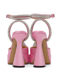 Silk satin heels in pink. · Crystal-cut hardware throughout · Pointed toe · Heart appliqués at vamp · Wraparound pin-buckle ankle strap · Covered platform midsole · Covered block heel with rubber injection · Leather outsole · Silver-tone hardware · Platform: H1.5" · Heel: H5" Supplier color: Pink