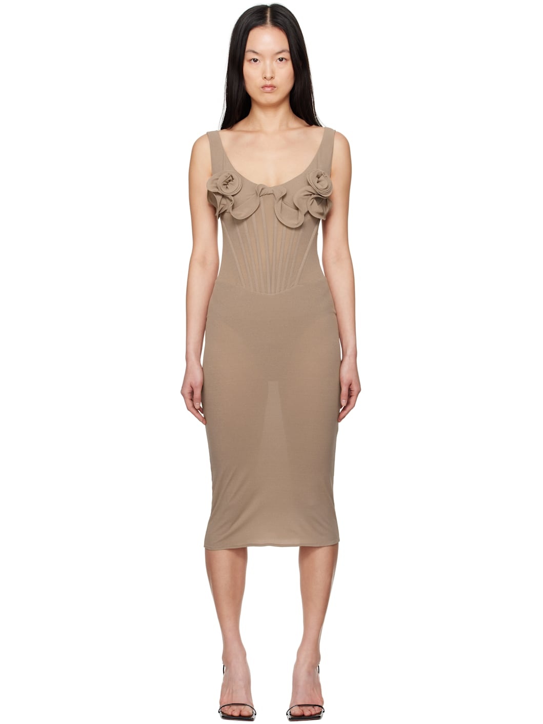 Semi-sheer stretch silk crepe midi dress. · Off-the-shoulder construction · Floral appliques and ruffled trim at front · Boning at bodice · Integrated bodysuit-style underlay Supplier color: Beige Body: 85% silk, 15% elastane. Lining: 100% cotton. Made in Poland 251533F054000