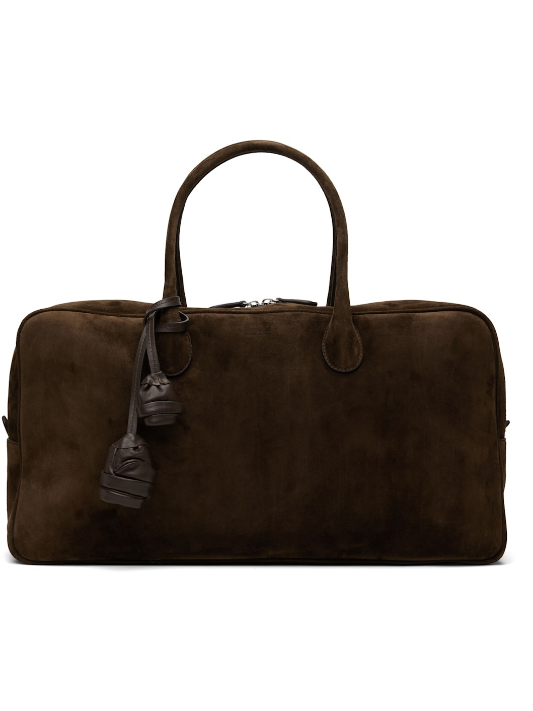 Calfskin suede top handle bag in brown. · Twin rolled carry handles · Detachable floral lanyard at handle base · Bumper studs at base · Two-way zip closure · Patch and zip pocket at interior · D-ring at interior · Canvas lining · H9.5" x W18" x D6.5" Supplier color: Brown suede Calfskin. Made in Italy 251533F046005