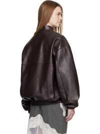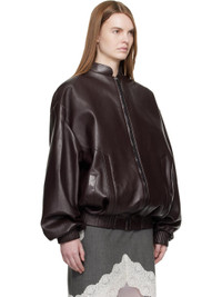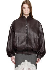 Crinkled sheepskin bomber jacket. · Stand collar · Zip closure · Welt pockets at waist · Elasticized hem and cuffs · Dropped shoulders · Balloon sleeves · Logo embossed at back collar · Viscose twill lining Supplier color: Burgundy Body: 100% sheepskin. Lining: 100% viscose. Made in Poland 252533F064001