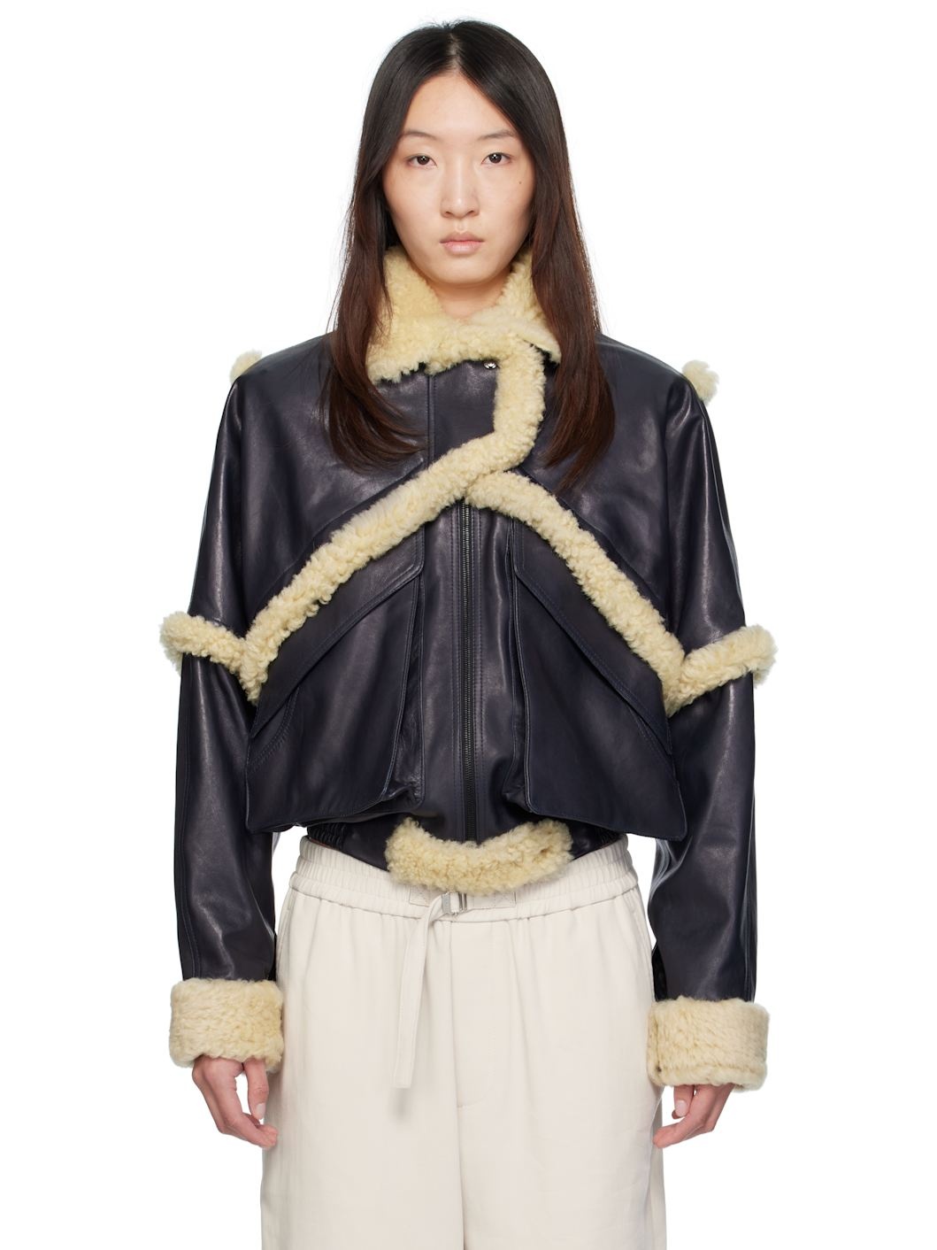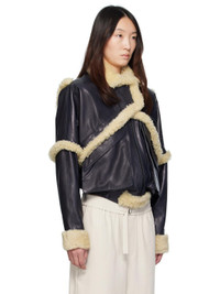 Grained sheepskin bomber jacket. Shearling trim throughout. · Spread collar · Press-stud tabs at zip closure · Flap pockets · Elasticized hem · Press-stud barrel cuffs · Full viscose twill lining Supplier color: Navy Body: 100% sheepskin. Lining: 100% viscose. Made in Poland 252533F064003