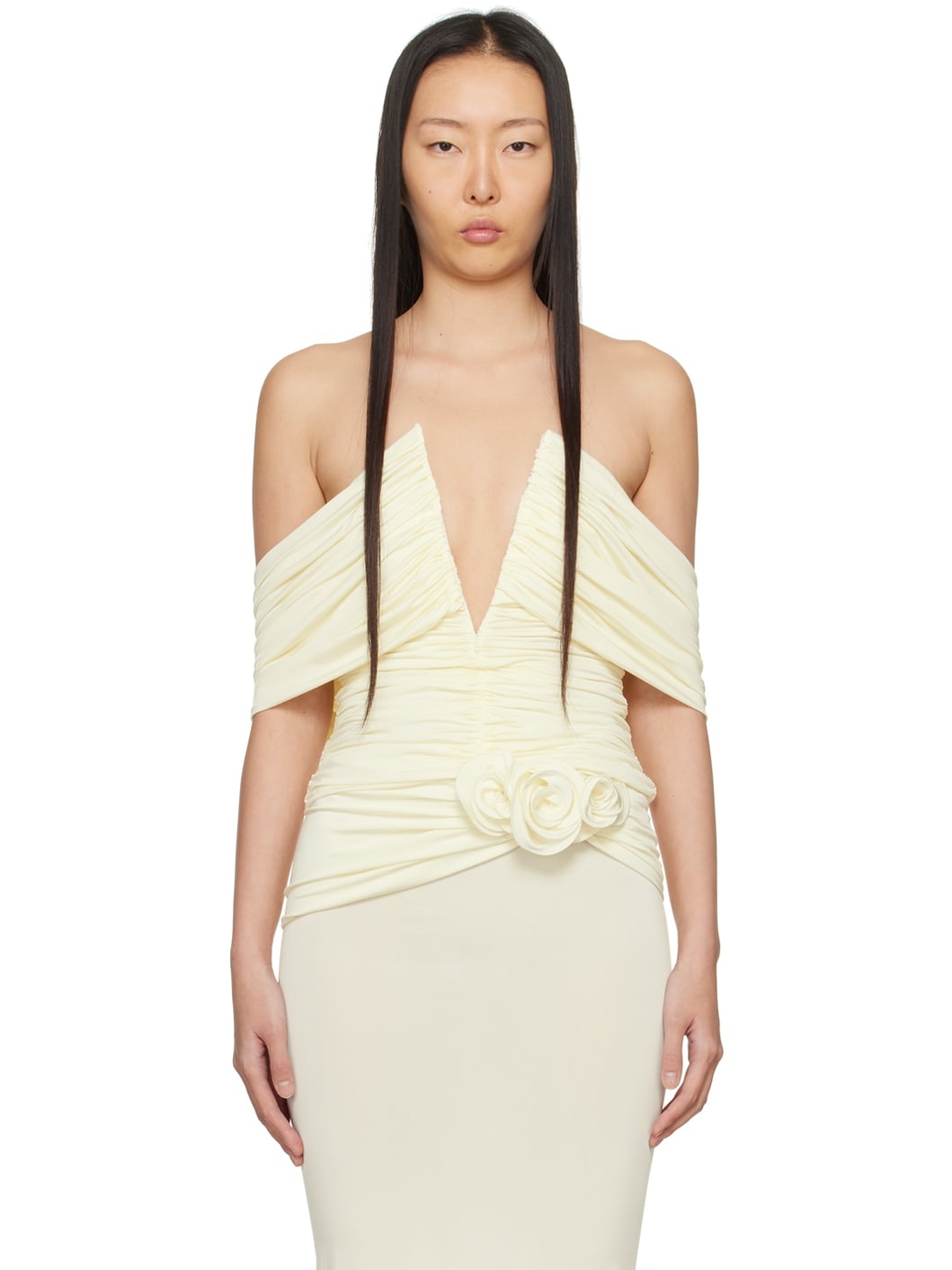 Stretch viscose satin top. Ruching throughout. · Off-the-shoulder construction · Concealed wire at plunging V-neck · Draping at back · Zip closure at back Supplier color: Cream 95% viscose, 5% elastane. Made in Poland 241533F107002