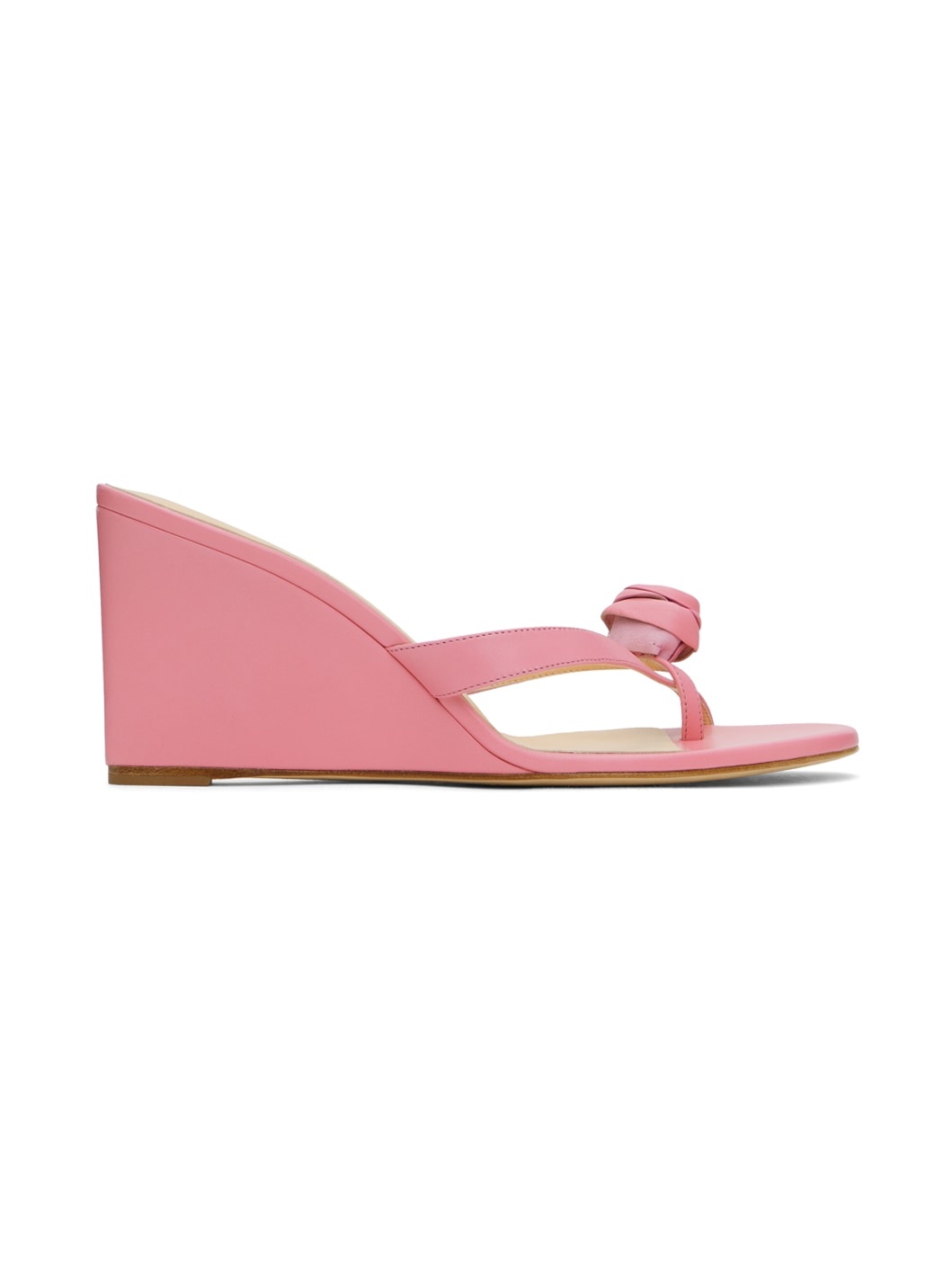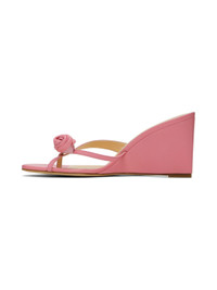 Grained calfskin slip-on heeled sandals in pink. · Open toe · Floral applique at thong-style strap · Logo embossed at padded footbed · Covered wedge heel with rubber injection · Patent calfskin sole · Heel: H3" Supplier color: Pink Upper: calfskin. Calfskin, rubber. Made in Italy 241533F125009