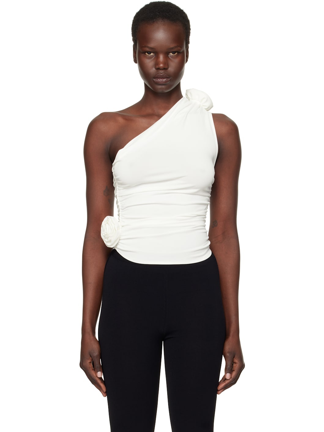 Lightweight stretch viscose jersey top. · Single-shoulder construction · Floral applique at side seam and shoulder · Ruching at side seams Supplier color: Cream 97% viscose, 3% elastane. Made in Poland 251533F111006