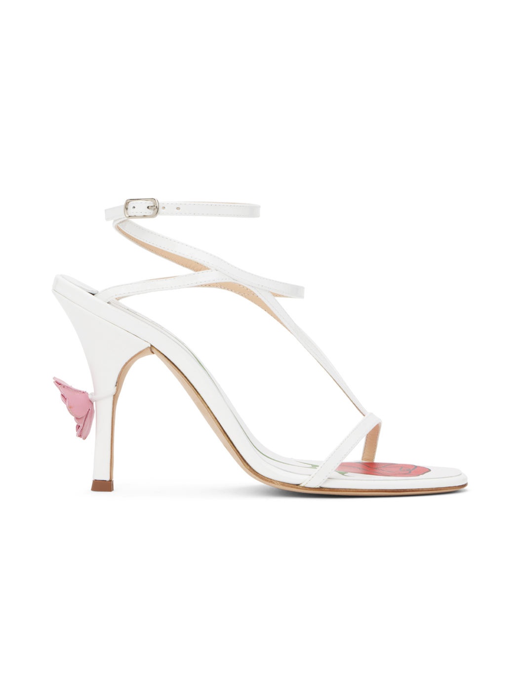 Patent calfskin heeled sandals in white. · Open toe · Straps at vamp · Wraparound pin-buckle ankle strap · Logo and graphic printed at calfskin footbed · Floral applique at heel · Covered stiletto heel with rubber injection · Nubuck sole · Heel: H4.25" Supplier color: White Upper: calfskin. Sole: calfskin, rubber. Made in Italy 242533F125003