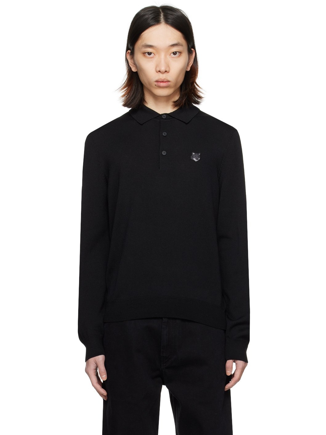 Rib knit wool polo. · Spread collar · Three-button placket · Embroidered logo patch at chest Supplier color: Black