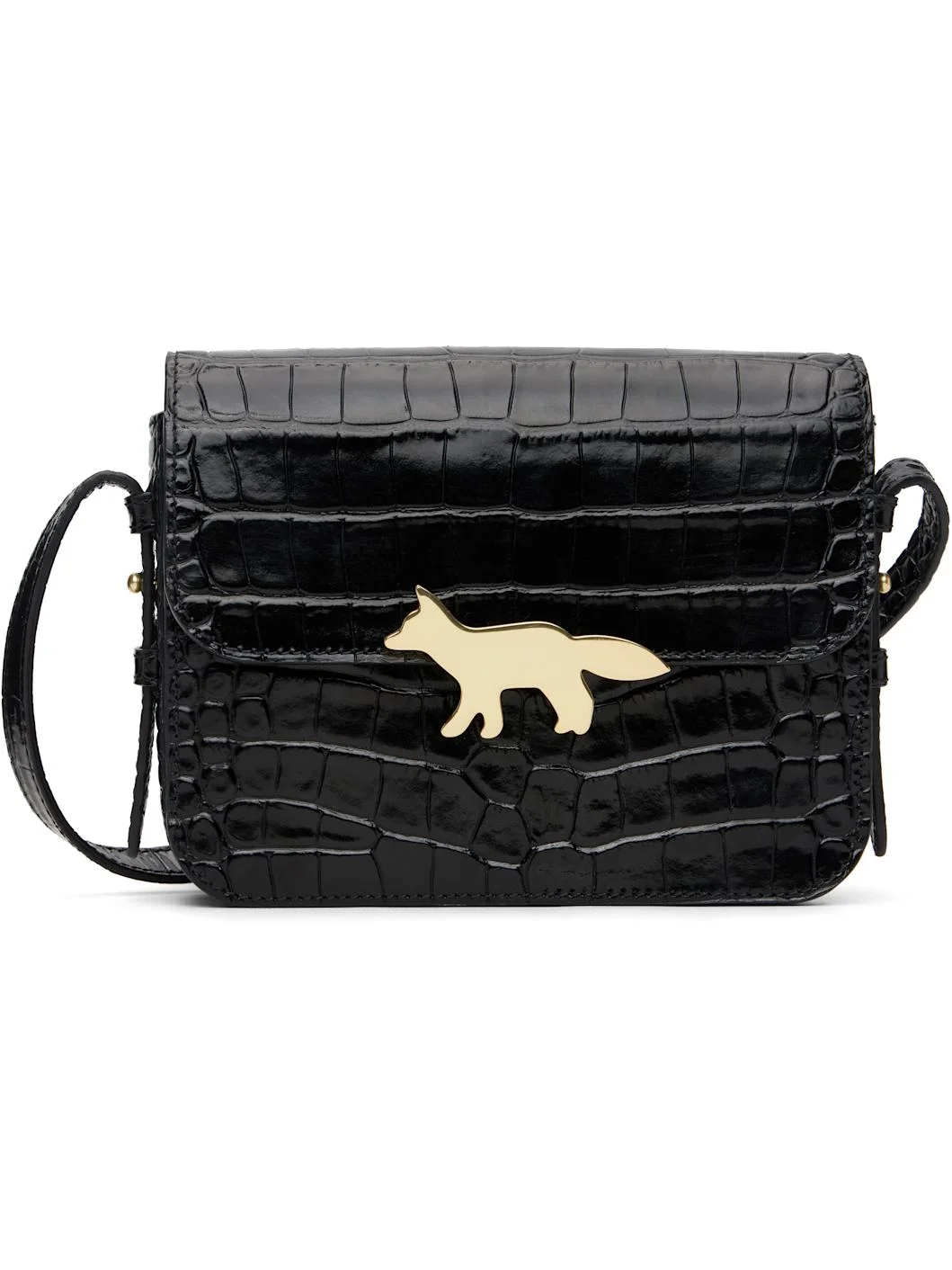 Croc-embossed leather shoulder bag. · Adjustable and detachable crossbody strap · Logo stamp at back face · Logo hardware at post-stud flap · Card slot at three-compartment interior · Patch pockets · Twill lining · H6” x W7.75” x D2.75” Supplier color: Black Leather. Made in Tunisia 261389F048006