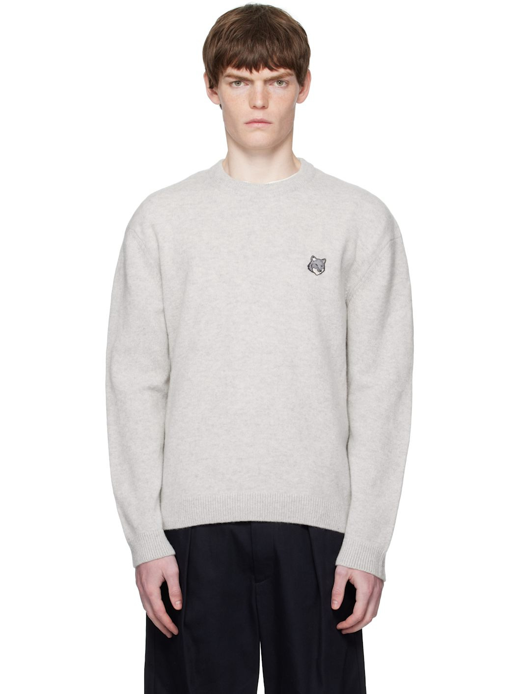 Knit wool sweater. · Rib-knit crewneck, hem, and cuffs · Embroidered logo patch at chest · Dropped shoulders Supplier color: Light grey melange 100% wool. Made in Morocco 252389M201004