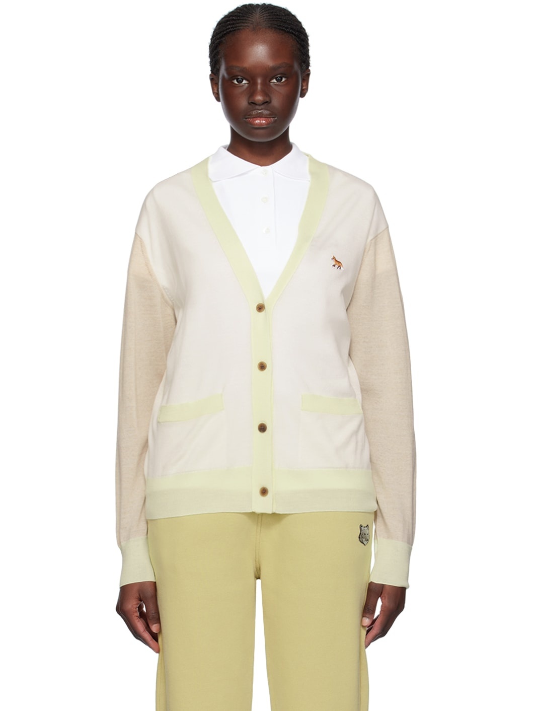 Knit wool cardigan. · Rib knit Y-neck, hem, and cuffs · Button closure · Embroidered logo patch at chest · Patch pockets Supplier color: Ecru 100% wool. Made in Portugal 241389F095004