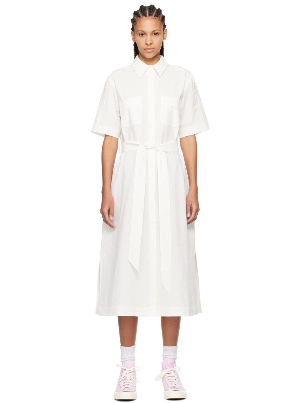 Crinkled cotton poplin shirt-style dress. · Spread collar · Button closure · Patch pockets · Detachable self-tie belt · Flared hem · Seam pockets · Vented side seams · Dropped shoulders · Pinched seam at sleeves · Embroidered logo patch at back collar · Cotton oxford cloth slip-style underlay Supplier color: White Body 1: 100% cotton. Body 2: 100% cotton. Made in Bulgaria 241389F054000