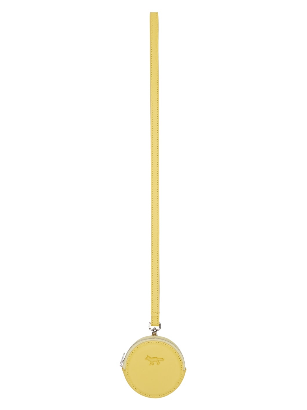 Grained leather coin pouch in yellow. · Detachable lanyard strap · Logo hardware at face · D-ring at back face · Zip closure · Cotton twill lining · Logo-engraved silver-tone hardware · H3.25" x W3.25" x D0.75" Supplier color: Lime green Body: 100% leather. Lining: 100% cotton. Made in Spain 241389M164009