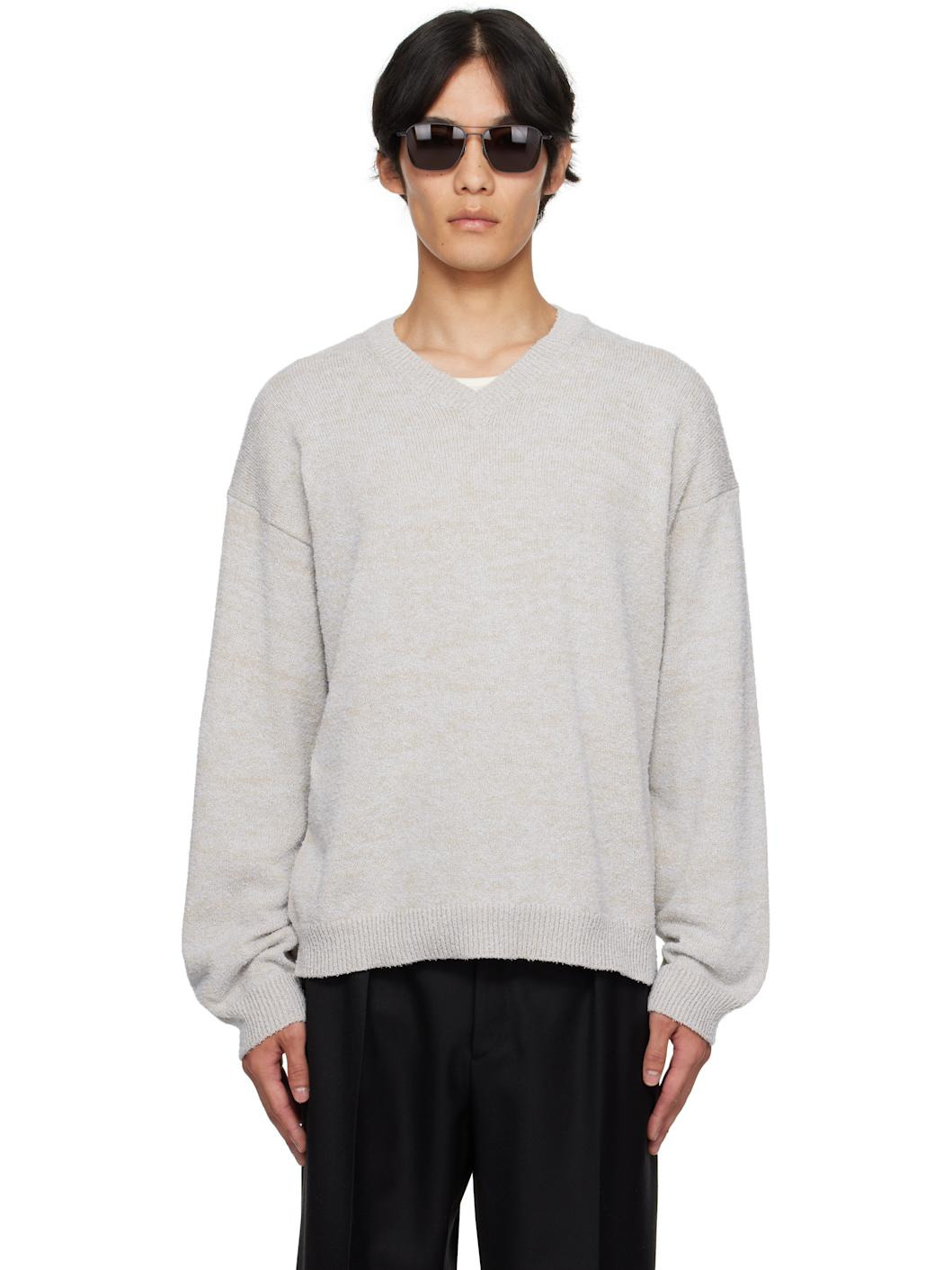 Knit cotton-blend sweater. · Subtle pilling throughout · Rib-knit V-neck, hem, and cuffs · Dropped shoulders · White stitching at back collar Supplier color: Ice blue/Beige 84% cotton, 9% wool, 7% polyamide. Made in Italy 252168M206001