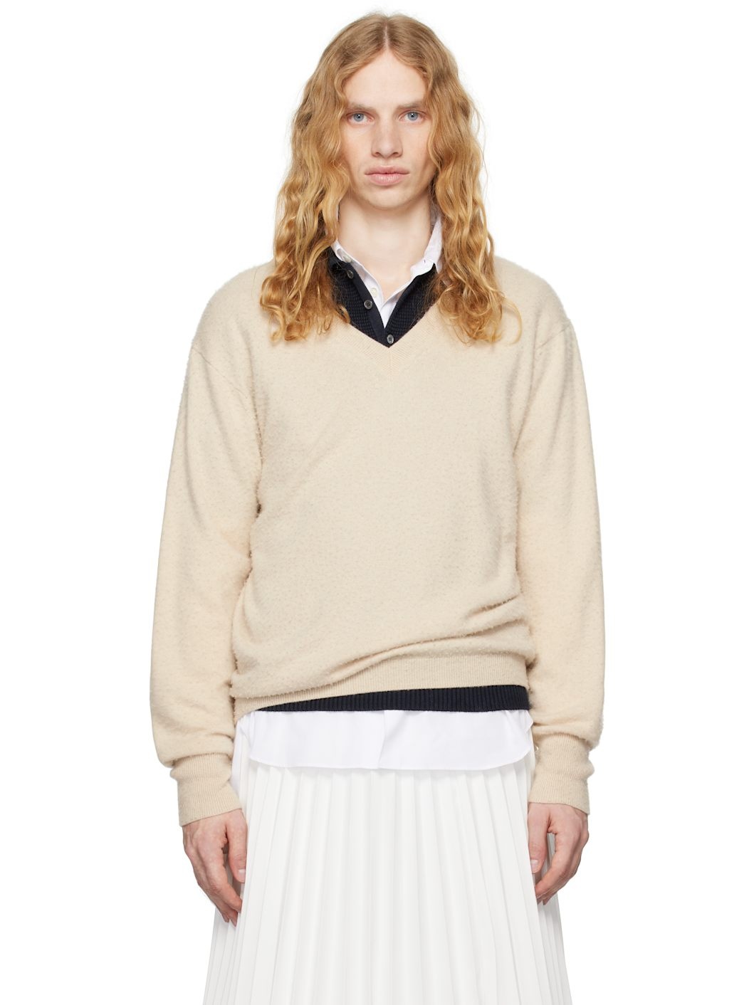 Knit slub cashmere- and cotton-blend sweater. · Rib-knit V-neck, hem, and cuffs · Dropped shoulders · White stitching at back Supplier color: Beige 78% cashmere, 22% cotton. Made in Italy 242168M206001