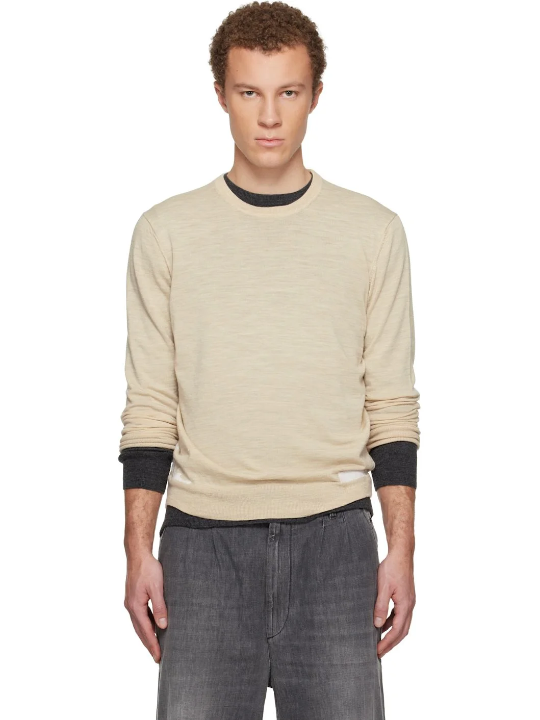 14-gauge knit wool-blend sweater. · Rib-knit crewneck, hem, and cuffs · Knit patches at front · White stitching at back collar Supplier color: Pink beige 80% wool, 20% nylon. Made in Romania 261168M201004