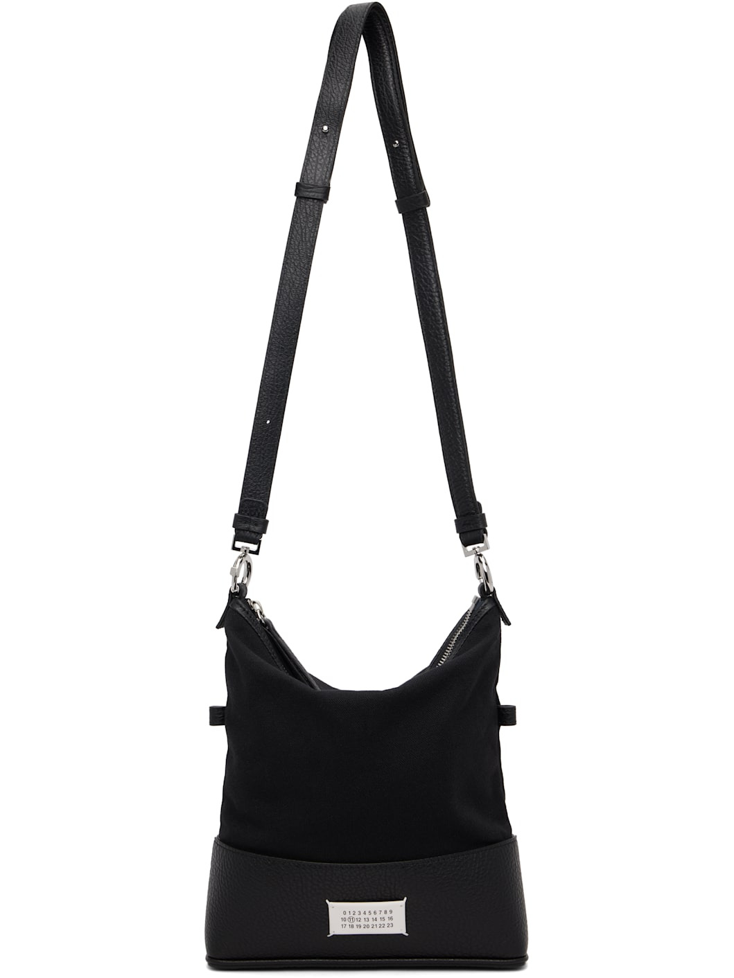 Cotton-blend canvas and pebble-grained calfskin messenger bag. · Paneled construction · Adjustable and detachable crossbody strap · Logo patch at face · White stitching at back face · Loop at sides · Zip closure · Patch pocket at interior · Cotton twill lining · Silver-tone hardware · H10" x W10" x D2" Supplier color: Black Body: 79% cotton, 16% polyester, 5% other fibers. Trim: 100% calfskin. Lining: 100% cotton. Made in Italy 252168M172003
