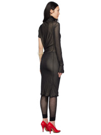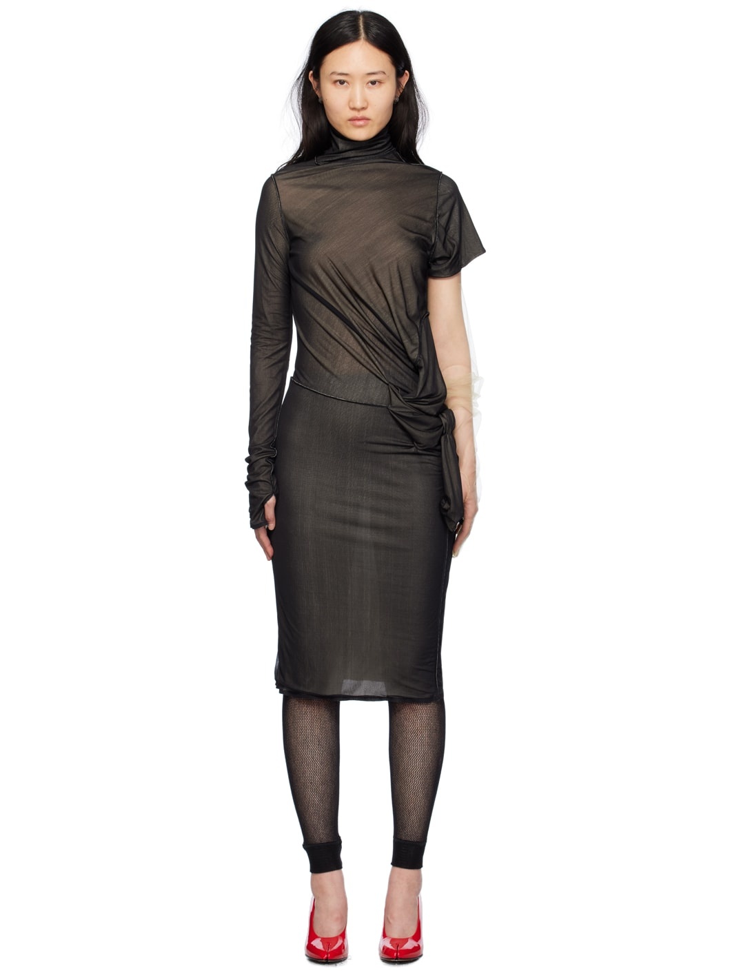 Semi-sheer viscose jersey dress. Exposed seams, raw edges, and loose thread detailing throughout. · Asymmetrical and layered construction · Turtleneck · Knotted appliqué and ruching at side seam · Thumbhole at cuff · Full viscose-blend jersey lining · White stitching at back collar Supplier color: Black/Butter