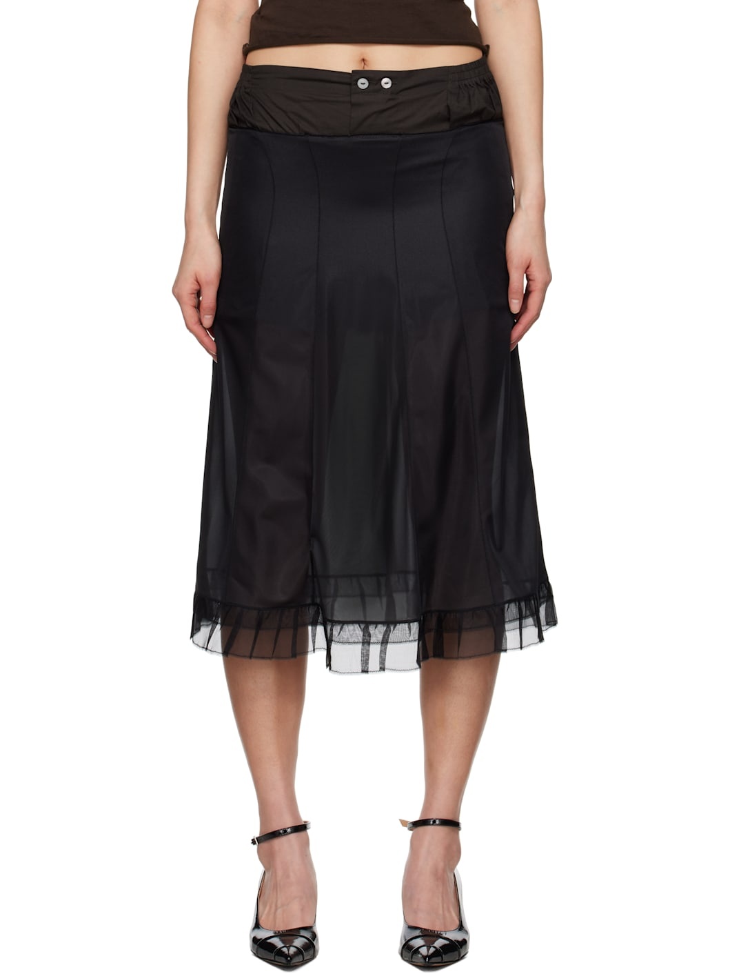 Semi-sheer plain-woven polyester midi skirt. · Paneled elasticized waistband · Ruffles at tiered hem · White stitching and bow at back waist · Plain-woven shorts-style lining Supplier color: Black/Brown Body 1: 100% polyester. Body 2: 100% cotton. Made in Italy 251168F092005