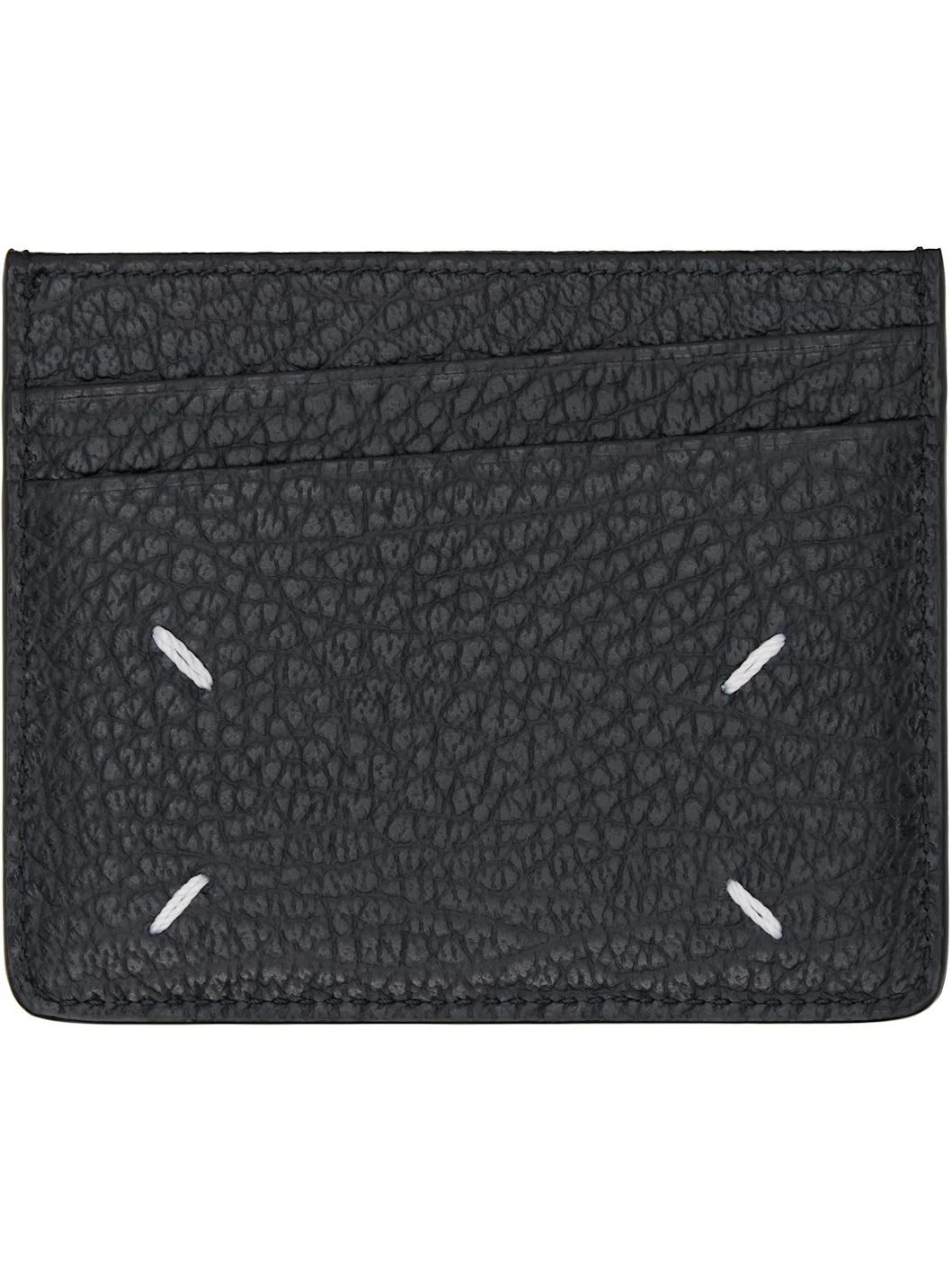 Grained calfskin card holder. · Stitching at face · Five card slots · Central note slot · Canvas lining · H3.25" x W3.75" Supplier color: Black Calfskin. Made in Italy 261168M163016