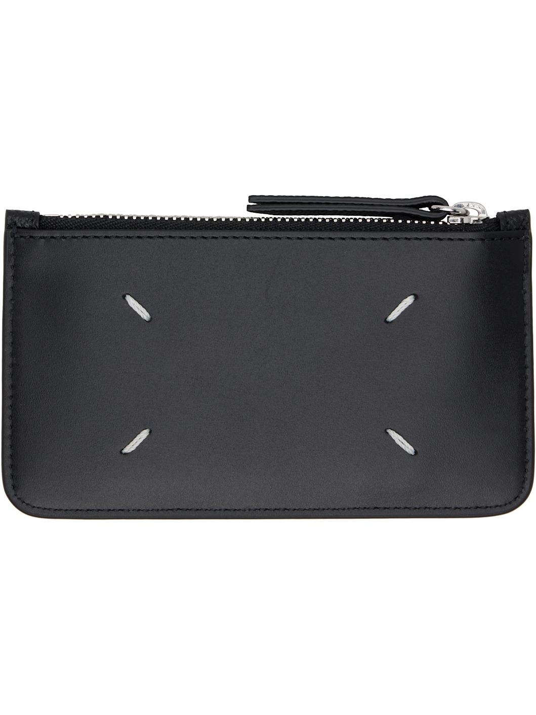 Pebble-grained and buffed calfskin card holder. · White stitching at face · Four card slots at back face · Zip closure · Canvas lining · H2" x W5" Supplier color: Black Calfskin. Made in Italy 252168M163008