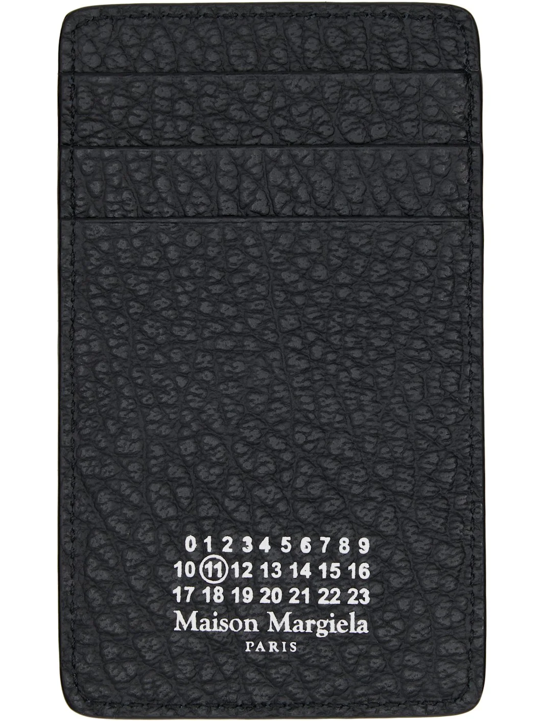 Grained calfskin card holder. · Stitching at face · Logo embossed at back face · Six card slots · Calfskin and canvas lining · H4.75” x W2.75” Supplier color: Black Calfskin. Made in Italy 261168M163008