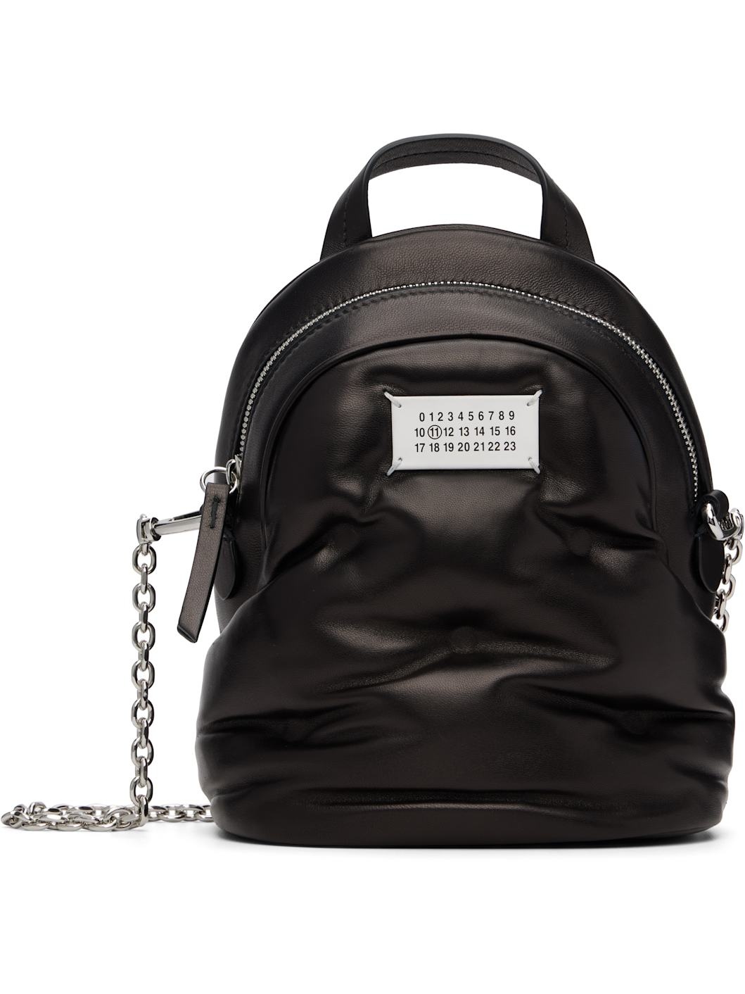 Buffed nappa lambskin backpack. · Carry handle at top · Detachable cable chain shoulder strap · Logo patch at face · D-ring and patch pocket at back face · Zip closure · Patch pocket at interior · Silver-tone hardware · H9” x W7.5” x D3.5” Supplier color: Black Body: 100% leather. Lining: 100% polyester. Made in Italy 252168F042000