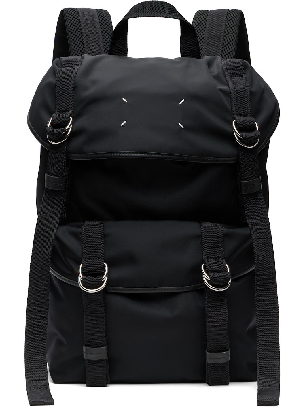 Satin twill backpack. · Buffed leather and webbing trim throughout · Carry handle · Adjustable padded shoulder straps · White stitching at face · Foldover flap compartment at face · Mesh pocket at sides · Padded mesh back face with ID slot · Foldover flap with press-release fastening · Concealed drawstring closure · Laptop compartment at interior · Twill and padded mesh lining · H19" x W12" x D5" Supplier color: Black Textile. Made in Italy 252168M166002