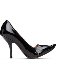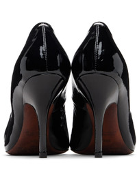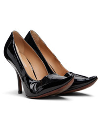 Patent goatskin heels. · Curved pointed toe · White stitching at heel collar · Buffed sheepskin lining · Covered stiletto heel with rubber injection · Calfskin sole · Heel: H3.75" Supplier color: Black Upper: goatskin. Sole: calfskin. Made in Italy 252168F122004