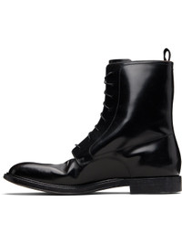 Ankle-high polished calfskin boots. · Lace-up closure · Pull-loop and white stitching at back collar · Distressing at back collar · Buffed calfskin lining · Stacked calfskin heel with rubber injection · Calfskin sole Supplier color: Black Calfskin. Made in Italy 252168M255003