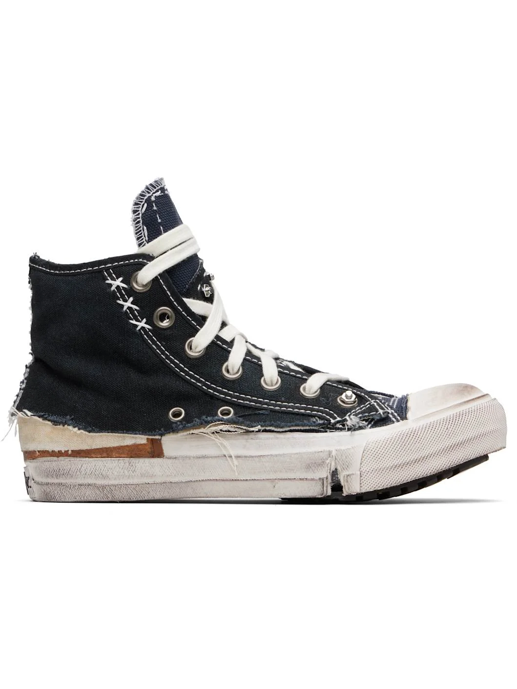 High-top cotton canvas sneakers. · Distressing and smudging throughout · Rubber cap toe · Lace-up closure · Studs at tongue and sides · Eyelets at sides · Canvas lining · Rubberized logo patch at heel · Treaded rubber sole · Contrast stitching in white Supplier color: Blue/Black Upper: textile. Sole: rubber. Made in Viet Nam 252168F127000