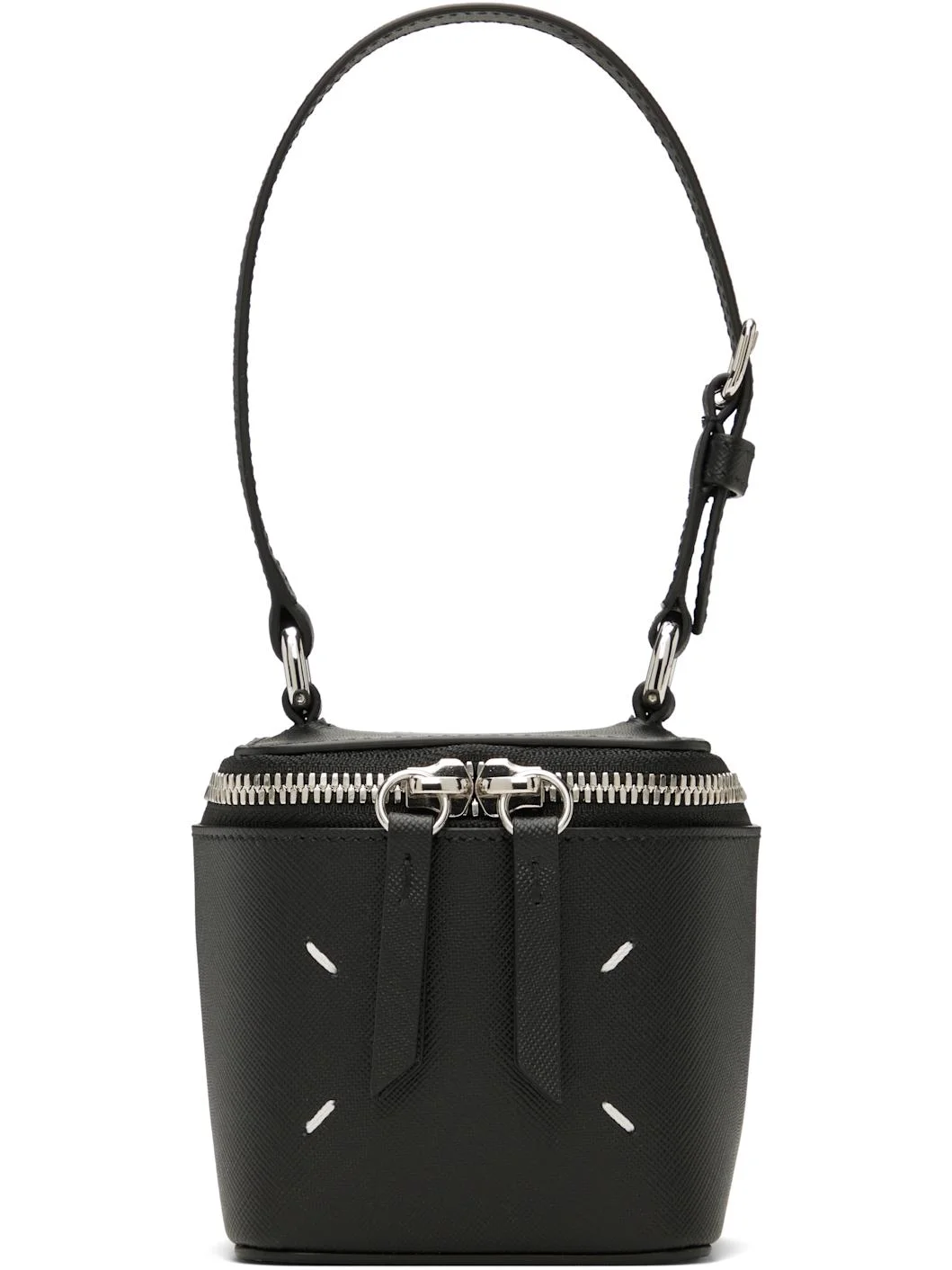 Saffiano calfskin top handle bag. · Adjustable carry handle · Stitching at face · Two-way zip closure · Card slot at interior · Microsuede lining · H4" x W4.5" x D4.5" Supplier color: Black Calfskin. Made in Italy 252168F046001