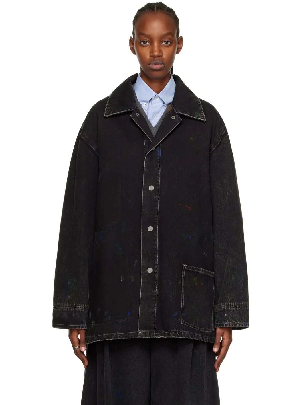 Non-stretch denim jacket. Fading and paint splatter effect throughout. · Spread collar · Press-stud closure · Patch pocket · White stitching at back collar · Full cotton flannel lining Supplier color: Black 100% cotton.